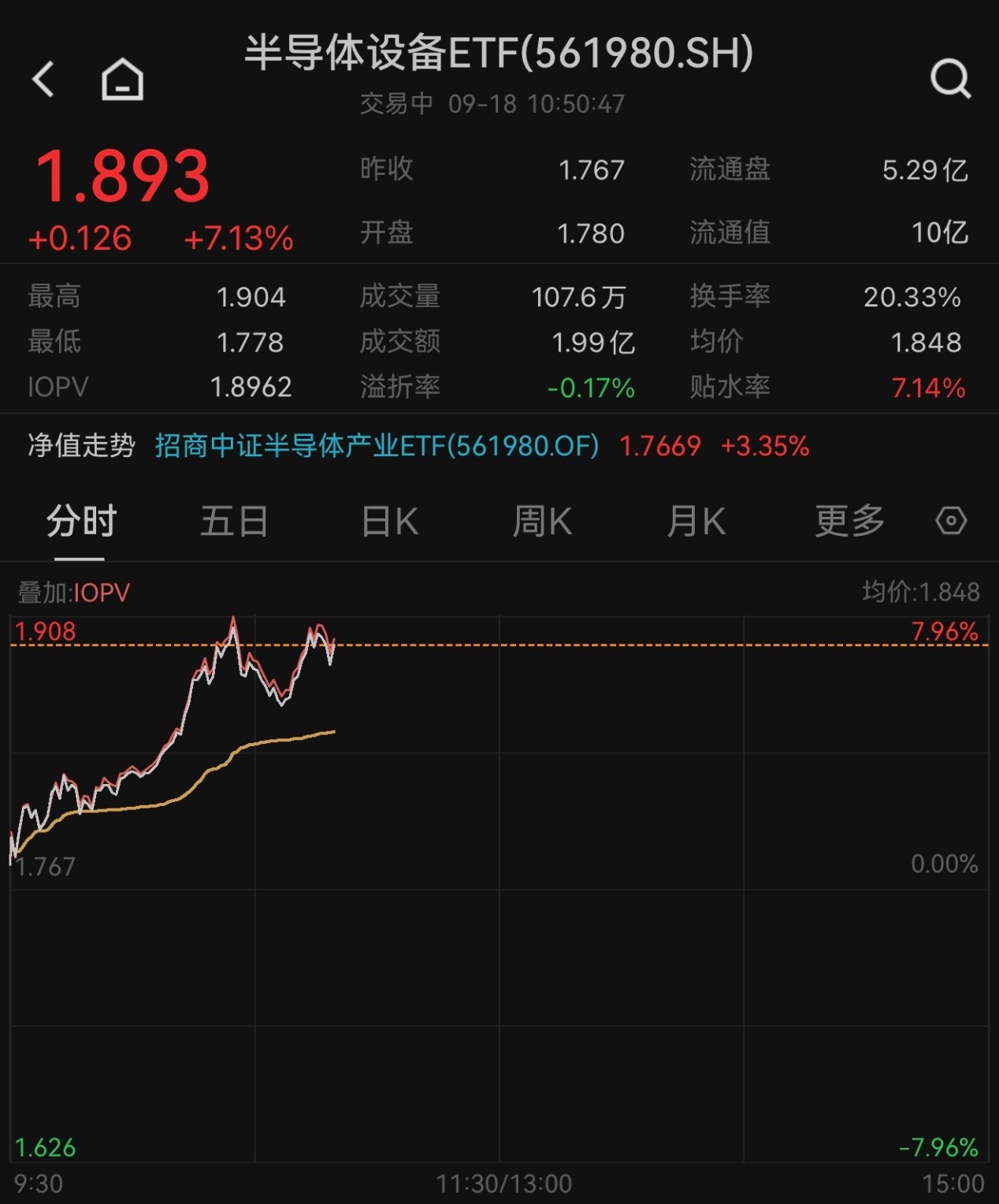 9月18日,三大股指开盘后上扬,盘面上半导体延续强势行情,GPU、光刻机、光芯片、先进封装等概念全线上涨。相关ETF中,半导体设备ETF(561980)早盘高开高走,截至发稿涨幅扩大至7.13%,成交额近2亿元。